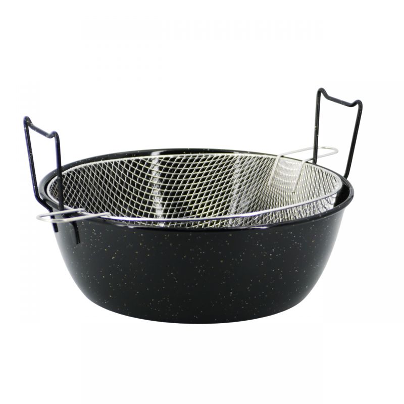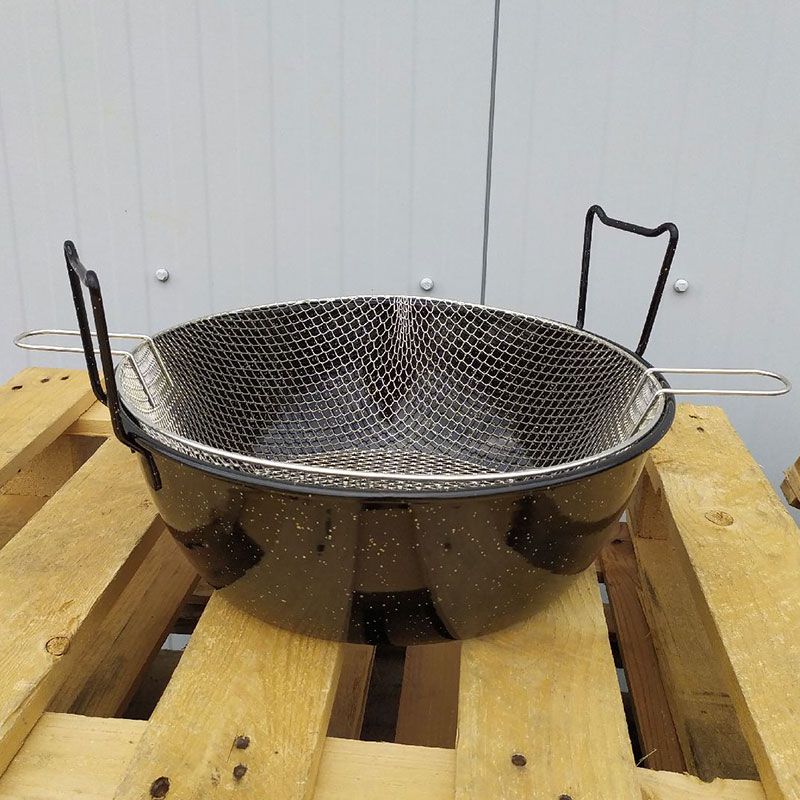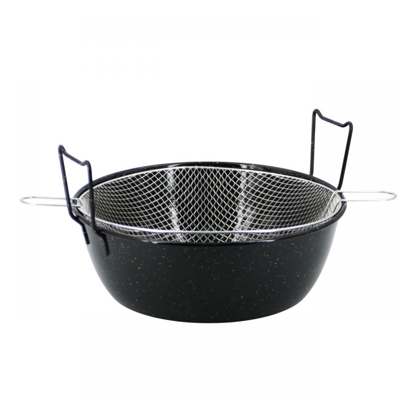 Plat de cuisson rond émaillé + panier friture spécialement conçu pour la cuisson des frites et des beignets.