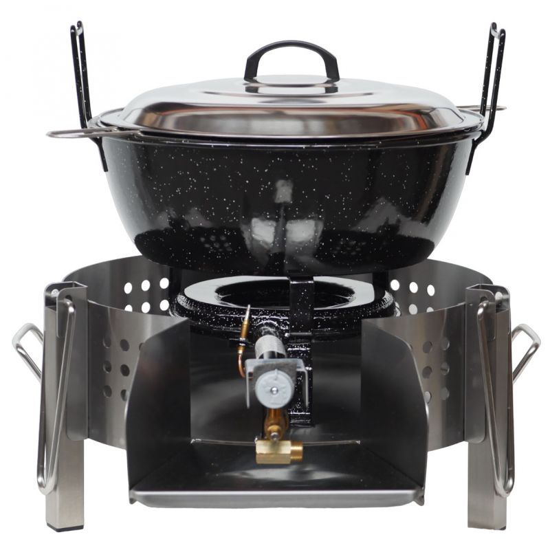 Kit Friteuse professionnel à gaz avec pare-flamme en inox - 11 litres + Couvercle inoxRéchaud équipé d'un pare-flamme en inox avec trépied renforcé et démontable de 80cm de hauteurPlat de cuisson rond émaillé + panier friture spécialement conçu pour la cuisson des frites et des beignets.Diamètre haut du plat: 35cmHauteur du plat +...
