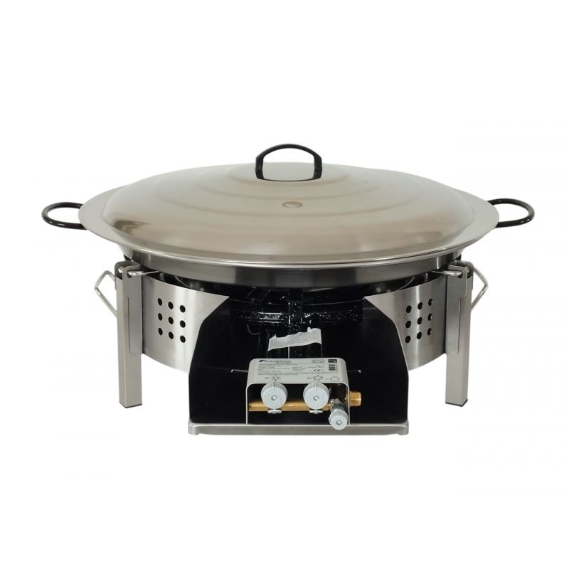Kit paella luxe pour plan de travail - poêle inox 30 portions - réchaud thermocouple au choixVotre ensemble de cuisson espagnol regroupe : - un plat traditionnel en inox (diamètre: 70cm) avec son couvercle inox - un serpentin à gaz propane avec thermocouple (diamètre: 46cm ou 50cm) - un pare-flammes en inox 60cm -...