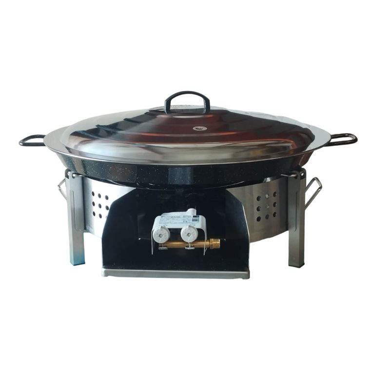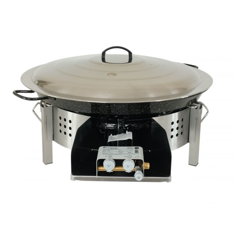 Kit à paella démontable pour 120 personnes avec plat en acier émaillé et couvercle en inoxCe kit comprend une poêle à paella en acier émaillé avec son couvercle en inox, un brûleur (entrée à visser : G1/2) équipé d'un pare-flamme INOX installé sur 3 minis pieds renforcés.Le pare-flamme protège la flamme de votre réchaud du vent...
