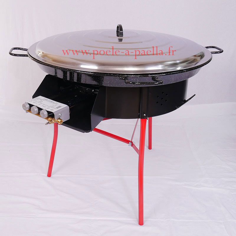Ensemble à paella complet pour 120 personnes comprenant :* Une poêle à paella en acier émaillé de diamètre : 115 cm * Un réchaud à gaz (Butane / Propane) de diamètre : 70 cm monté sur un trépied renforcé* En supplément, un Tuyau de gaz à visser* En supplément, un détendeur butane ou propane