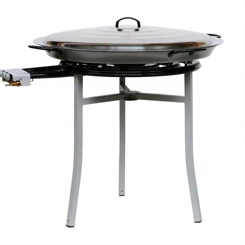 Ensemble à paella complet pour 120 personnes comprenant : - une poêle à paella en acier de diamètre 115 cm avec son couvercle en inox (en option) - un réchaud à gaz (butane/propane) de diamètre 70 cm - un trépied renforcé de 75 cm de haut Pour cuisiner en extérieur des recettes festives telles que paellas, fideuas, tartiflettes, chilis et bien...