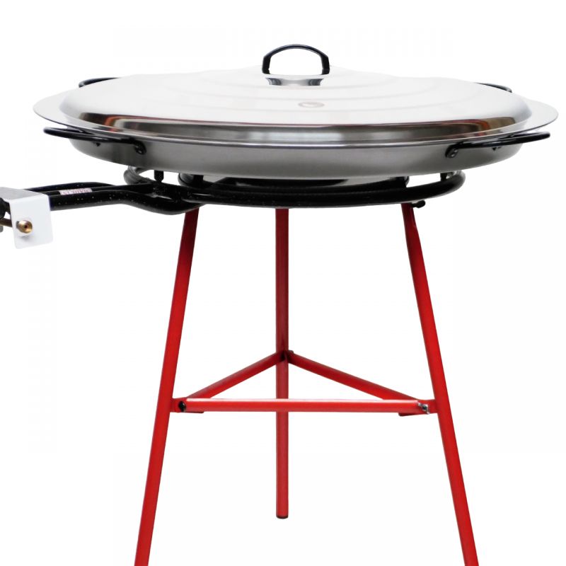 Ensemble à paella complet pour 120 personnes comprenant : - une poêle à paella en acier de diamètre 115 cm avec son couvercle en inox (en option) - un réchaud à gaz (butane/propane) de diamètre 70 cm - un trépied renforcé de 75 cm de haut Pour cuisiner en extérieur des recettes festives telles que paellas, fideuas, tartiflettes, chilis et bien...